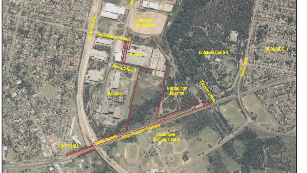 The site is at the end of Kellogg Road, Rooty Hill. The One Steel Mini Mill forms the site boundary to the west, Humes Pipe factory to the north, the railway and North Parade to the south, and Nurragingy Reserve to the east.